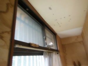 室内の天井や壁には雨漏れによるシミが何カ所も見受けられました。