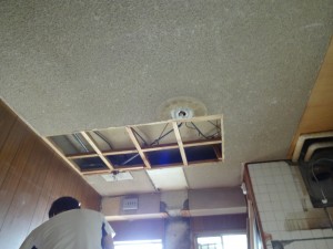 解体後の天井裏はこんな感じになっています。配線やら配管やらがいっぱいあります(^_^;)