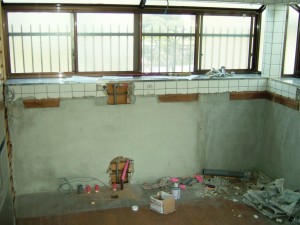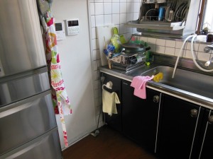 システムキッチン端にある厚みがある間仕切り壁は解体して、