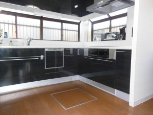 扉はオニキスブラックという色を選ばれました。以前のキッチンもダーク系の色だったので