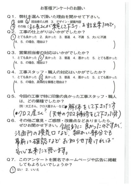 滋賀県大津市M様よりアンケートのご回答をいただきました☆ 2015年08月26日 お客様の声 アンケート 発注不備等、念入りに確認しましたが特注品の取り付けが遅れてしまいました。 にもかかわらず最後は笑顔で受け取って下さいました。 ご厚情に感謝すると共により一層の心配りが必要と痛快致しました。 大変貴重なご意見頂き、ありがとうございました。 営業・工務:田中 元行