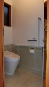 床はフローリングからタイルに張替ました!そのタイルを腰高まで設置。タイルなのでぬれても安心です。トイレはLIXILのサティスSを採用しました!自動開閉・自動洗浄のついた優れものです!