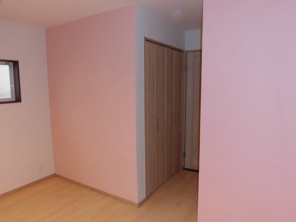 クロスを一面アクセントでピンク色にしました!床はメープル色にしているので、