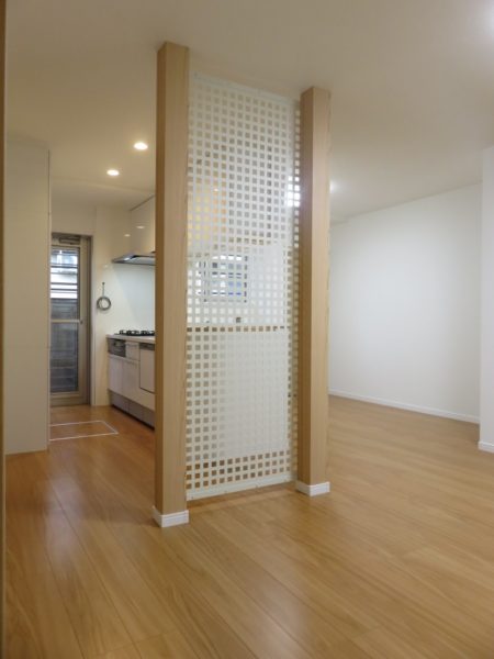 こちらはリビングです。この角格子の壁は『ぱんちくん』