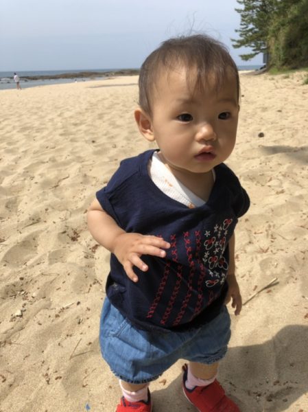 娘のはなさん初めての砂浜です。