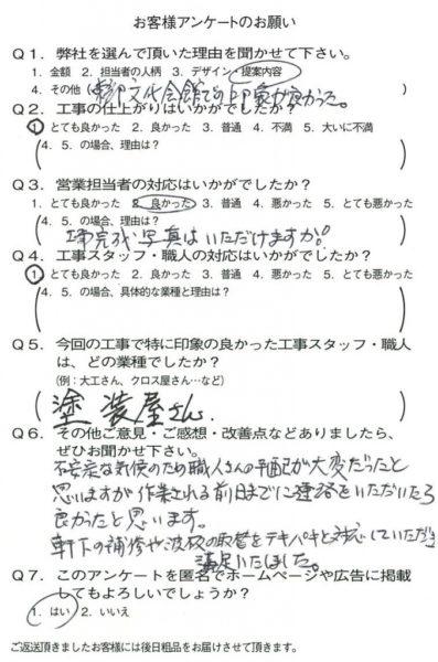 京都市山科区Y様よりアンケートのご返信いただきました。