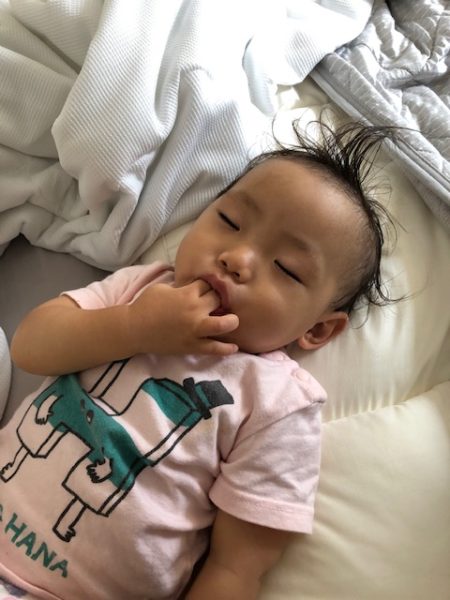 こちらは絶賛昼寝中のはなさんです。頭にものすごく汗をかくのでこんなことになっています(笑)お手てもしっかり口に入ってますね。
