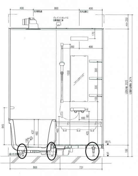上の図面の丸印のところが足ですね。この足が安定するように、下には土間コンクリートが必要なんです。