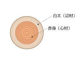 同じ木でも木材の中心部の赤みがかった部分を『赤身』まわりの白っぽい部分を『白太』と呼びます。人間に例えると赤身は骨格の部分