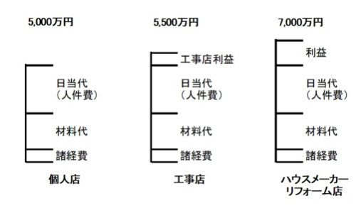 ハウスメーカーやリフォーム店の金額は高く、町の工務店や職人に直接頼むと安いみたいな、営業リフォーム店と書かれていることもよくあります。