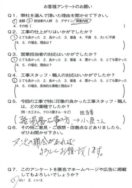 京都市山科区H様よりアンケートのご回答いただきました! 2020年07月21日 お客様の声 アンケート チラシを見てお問合せ頂きました! 新人営業マンの四方が担当させていただきました。 不慣れなところが多々あったと思いますが、 喜んでいただきとてもうれしいです。 これからもどうぞよろしくお願いいたします。
