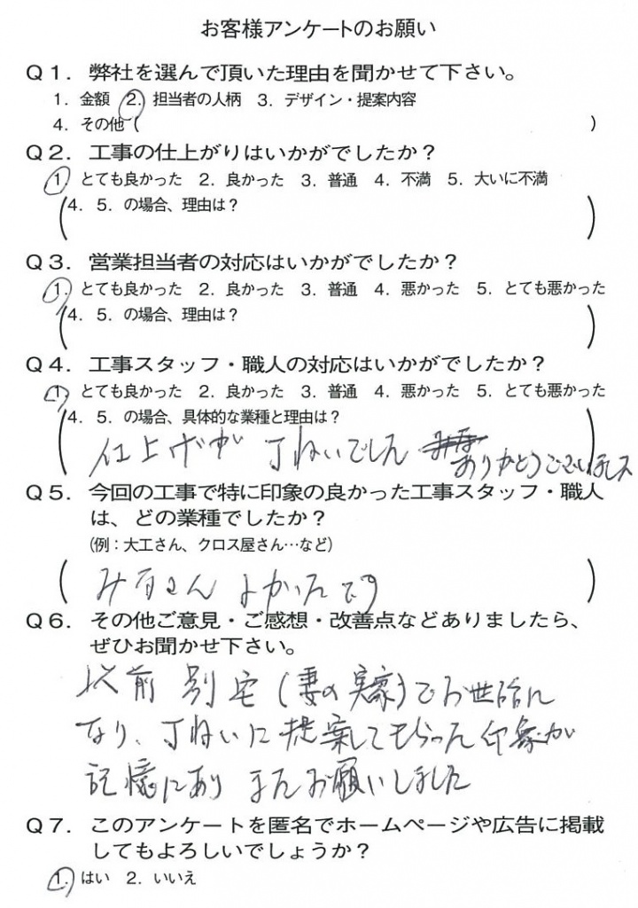 京都市山科区F様よりアンケートのご回答いただきました! 2020年10月07日 お客様の声 アンケート 営業・職人の対応を褒めていただきとてもうれしいです。 今後もお困りごとがあればお気軽にお声がけください! どうぞよろしくお願いいたします! 営業担当:荒竹 孝則
