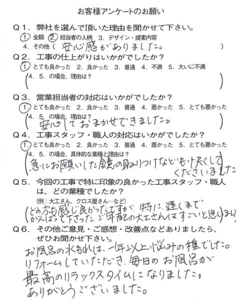 京都市上京区H様よりアンケートのご返信いただきました! 2021年01月07日 お客様の声 アンケート 雨漏れが解消され本当に良かったです! さらにお風呂の時間が最高のリラックスタイムに・・・ うれしい限りです! 今後ともどうぞよろしくお願いいたします!