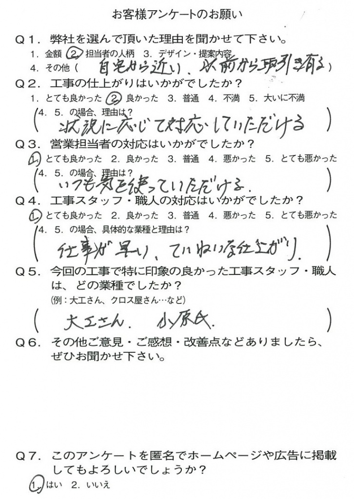 京都市山科区S様よりアンケートのご返信いただきました! 2021年01月25日 お客様の声 アンケート アンケートご返信ありがとうございます。 今後も何かありましたら、お気軽にお問合せください。 宜しくお願いいたします! 営業担当:荒竹 孝則