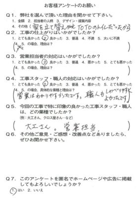 京都市山科区H様よりアンケートのご返信いただきました! 2021年04月07日 お客様の声 アンケート アンケートご返信ありがとうございます。 今後ともどうぞよろしくお願いいたします。 営業担当:堀池 皐