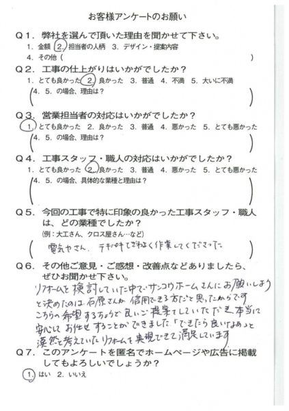 京都市伏見区I様よりアンケートのご返信いただきました。 2021年06月09日 お客様の声 アンケート うれしいお言葉ありがとうございます。 喜んでいただけるリフォームが出来て私もうれしいです。 今後ともどうぞよろしくお願いします。 営業担当:石原 良太