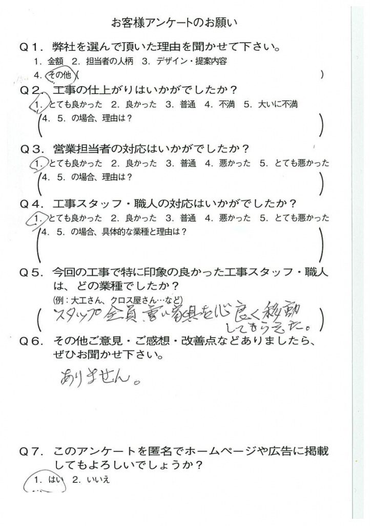 京都市山科区I様よりアンケートのご返信いただきました。 2021年08月25日 お客様の声 アンケート この度はご依頼をいただきありがとうございました。 今後ともよろしくお願いします。 営業担当:青木 俊介