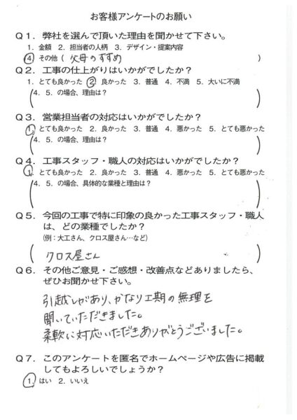 京都市山科区S様よりアンケートのご返信いただきました! 2021年10月02日 お客様の声 アンケート アンケートのご記入ありがとうございます。 励みになります! またお困りごとがございましたらお気軽にお尋ねください! 担当者:四方 風輝