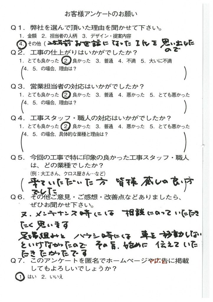 京都市北区Y様よりアンケートのご返信いただきました! 2021年11月15日 お客様の声 アンケート この度は25年ぶりにご依頼をいただきありがとうございます。 事前に連絡不足な部分があり申し訳ございません。 メンテナンスの際にはぜひご相談ください。 いつでもご連絡をお待ちしております。 担当者:荒竹 孝則
