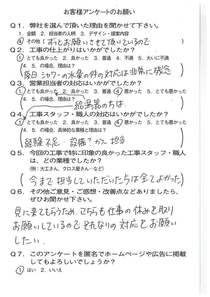京都市上京区Y様よりアンケートのご返信いただきました! 2022年06月28日 お客様の声 アンケート いつも工事をご依頼いただきありがとうございます。 貴重なご意見をいただきましてありがとうございます。 今後も安心してお任せいただけるように精進してまいります。 営業担当:荒竹孝則、青木俊介