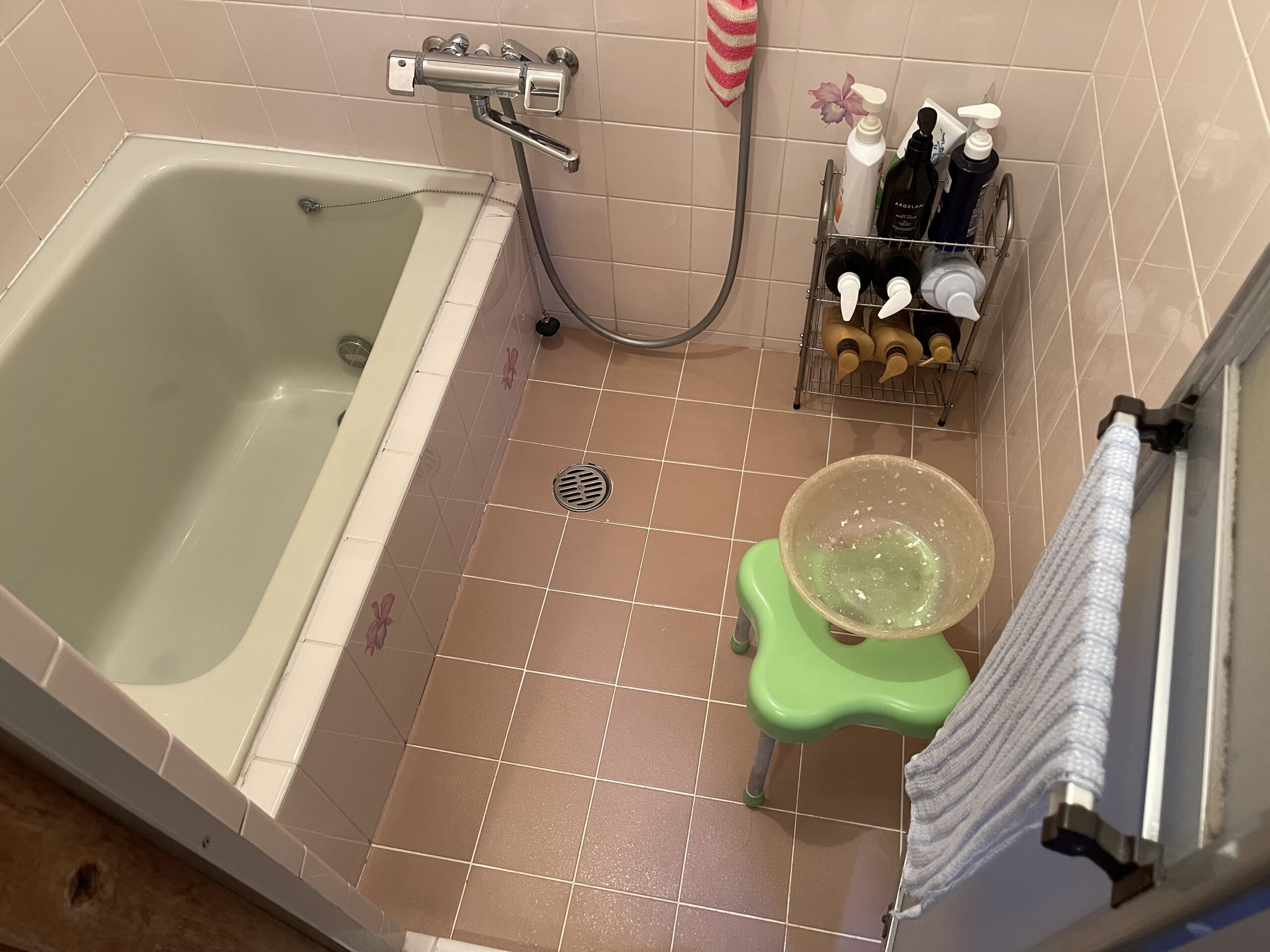 施工前の浴室はタイル張りでお手入れが大変でした。
