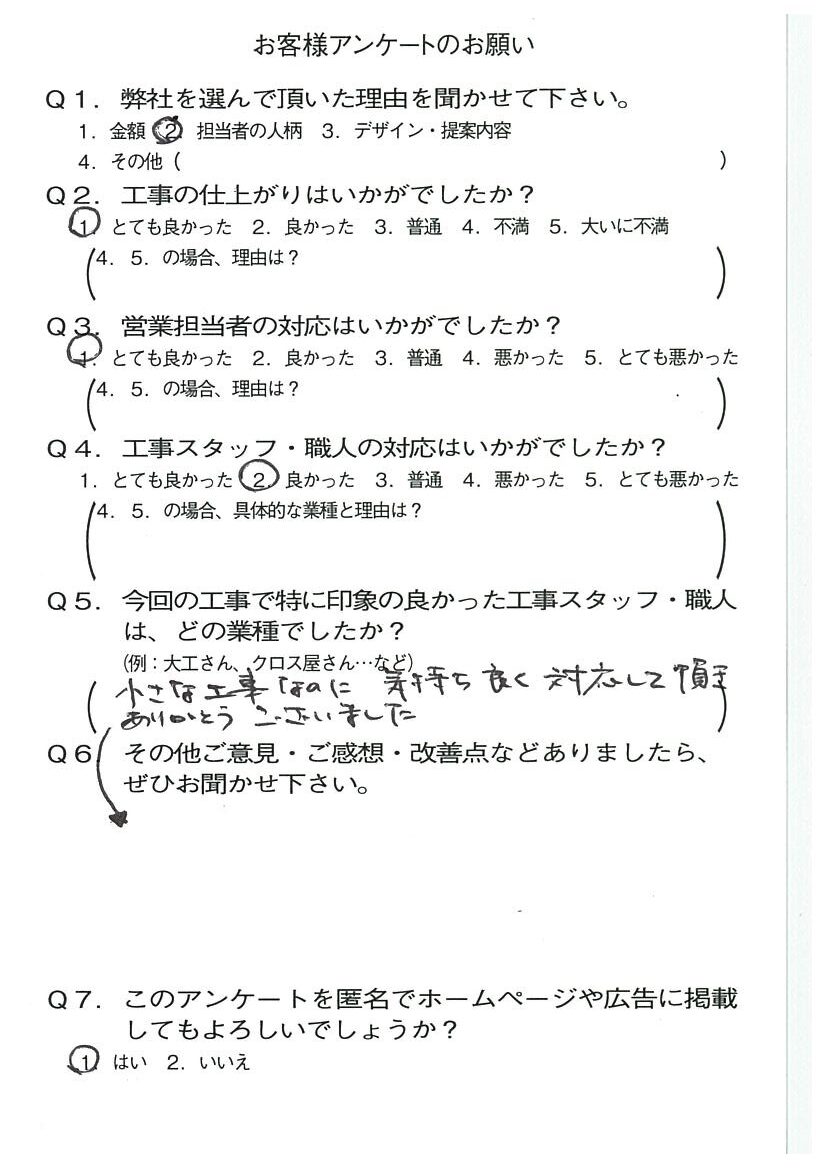 京都市北区Y様よりアンケートのご返信いただきました! 2022年08月10日 お客様の声 アンケート こちらこそご依頼をいただきましてありがとうございました。 また何かお困りごとがございましたらお気軽にお声がけください。 営業担当:大西 優衣