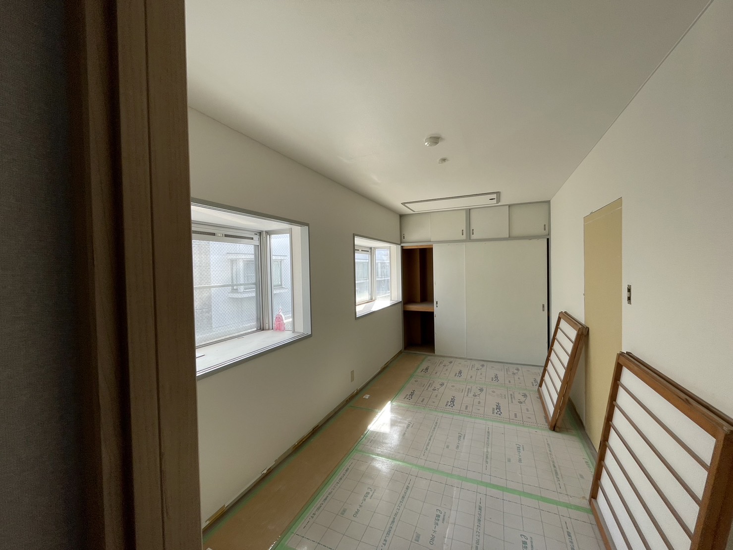 すでに施工が終わった部分にはフローリングに傷がつかないように養生をしてあります。