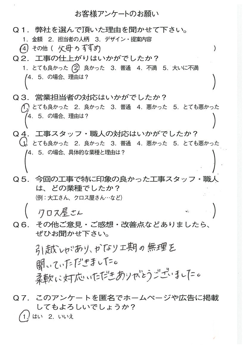 京都市下京区M様よりアンケートのご返信いただきました。 2023年04月04日 お客様の声 アンケート この度は工事のご依頼をいただきましてありがとうございました。 ご満足いただけて何よりです。 今後ともお困りごとがございましたらお気軽にご相談ください。 営業担当:四方 風輝