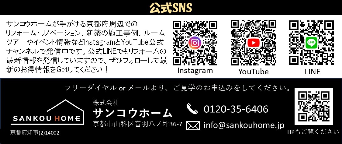 サンコウホームが手がける京都府周辺でのリフォーム・リノベーションの施工実例、リフォームルームツアー、イベント情報などをInstagramとYouTube公式チャンネルで発信中。