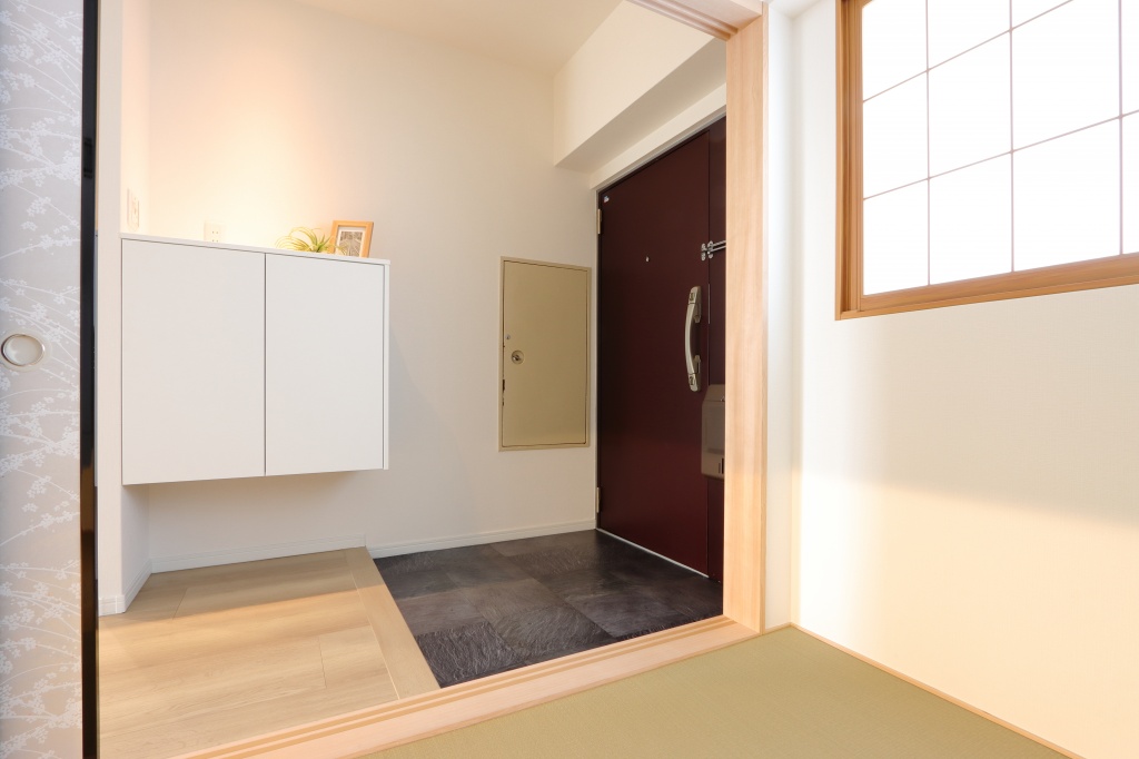 玄関は和室との調和を考えて、土間は石目調のフロアタイルで仕上げました!