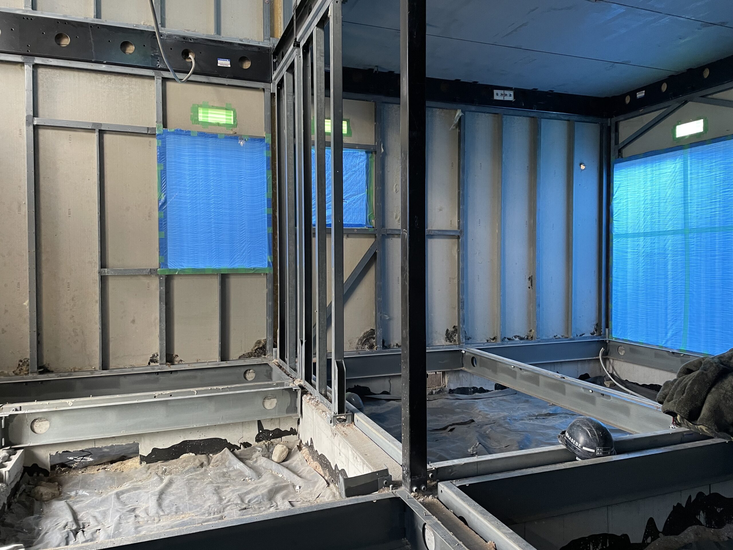 外壁の一部が解体されて、サッシがあった部分にはブルーシートで養生をしています。