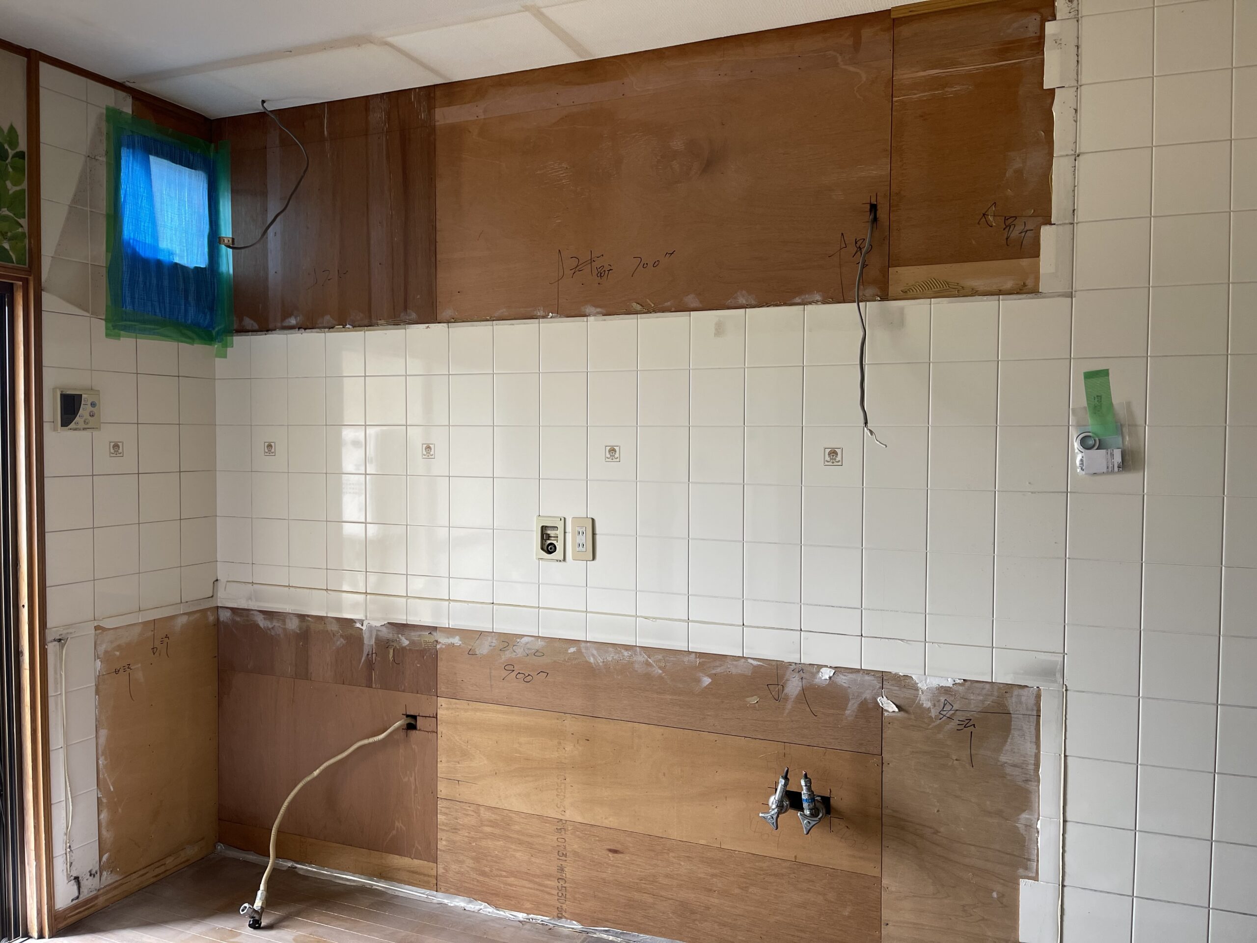キッチンが取り外され、下地やいろいろな設備の配線などが見えている状態です。