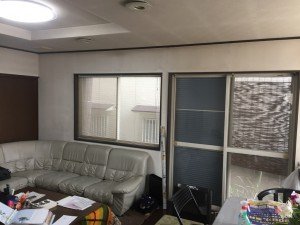 クロスの貼り替え工事をさせて頂く事になったLDKの現状です。白いクロスには日焼け、くすみ、ひび割れなどが多数見受けられました。特にサッシ廻りはひび割れが目立ちました。