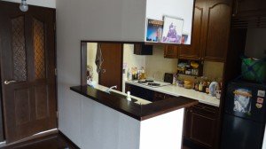 2列並列で配置されているキッチンです。リビング側にシンクがあり、背面の壁側にガスコンロがあります。動線が悪いから不要な物は撤去したいとのご要望です。