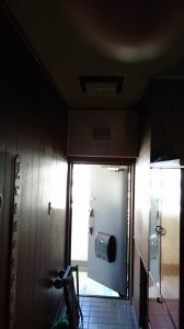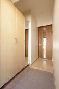 玄関にはシューズボックス、カップボード、家電ラックが直列で並べられており、キッチンとの間仕切りの役目も果たしておりました。