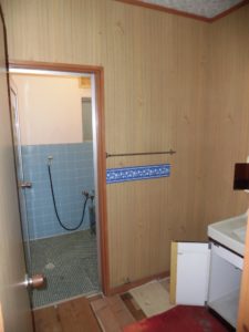 木目のプリントべニヤが張られた洗面室でした。