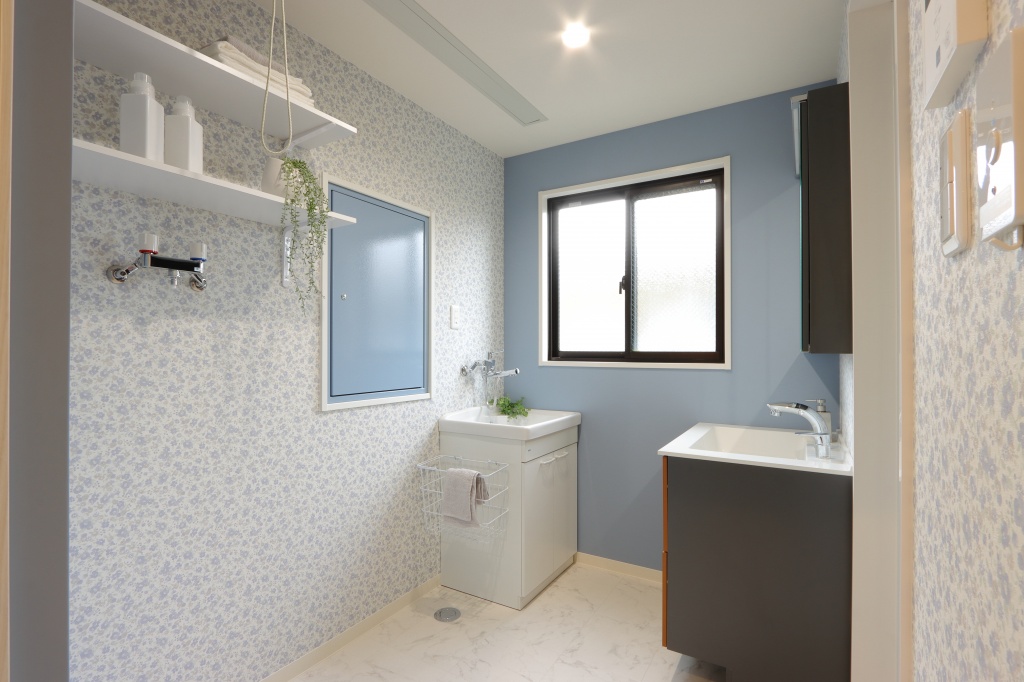 洗面室改修工事!ブルーグレーのクロスでシンプルに可愛く!付け置き洗い用の洗面台や天井埋め込み型の物干し設置で生活スタイルに合わせた洗面室に!~京都市左京区T様邸~