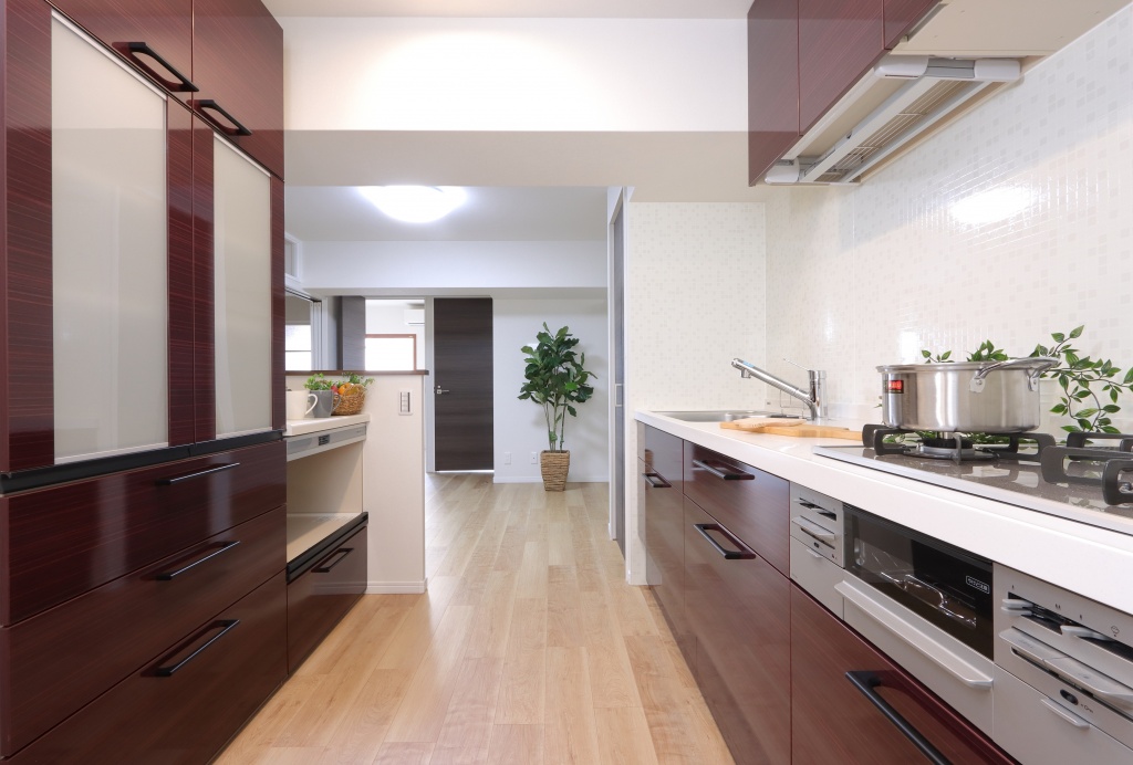 キッチンはカップボードも合わせた、ワインレッドのキッチンに。