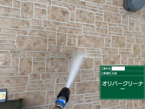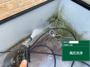 足場を組んだ後は、オーバークリーナーを使用して高圧洗浄をしていきます。