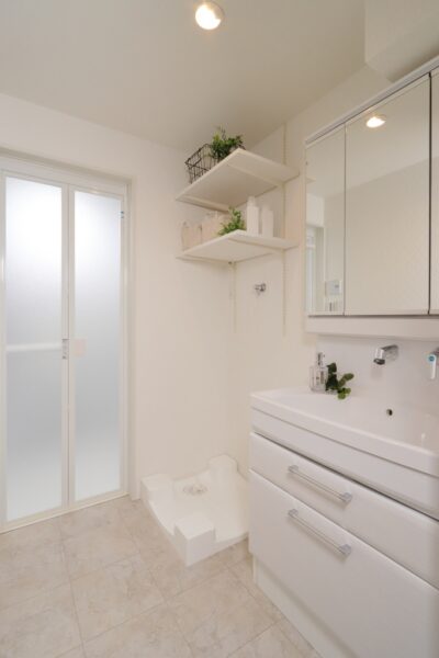 洗面所の広さを可能な限り広げたので、洗濯機の出っ張りで不便だった浴室の出入りもスムーズにできるようになりました。