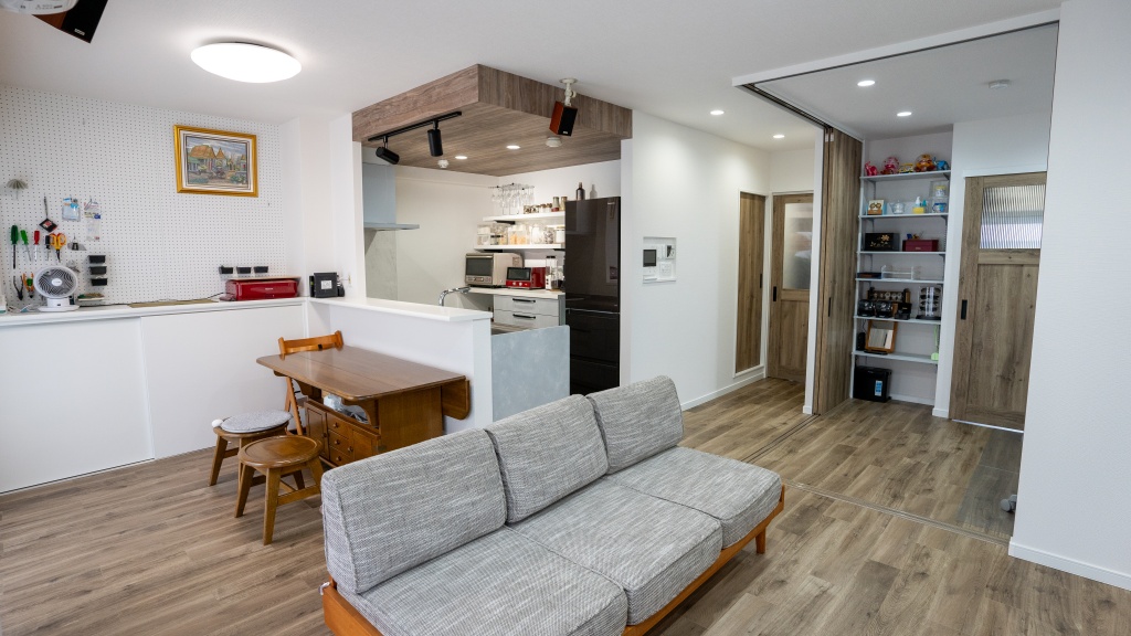 キッチン周り、和室周りの垂れ壁、袖壁は撤去し、広々としたLDKに。