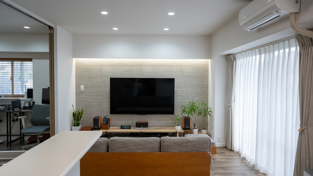 リビングには壁かけのテレビを設置。テレビの配線が見えないように