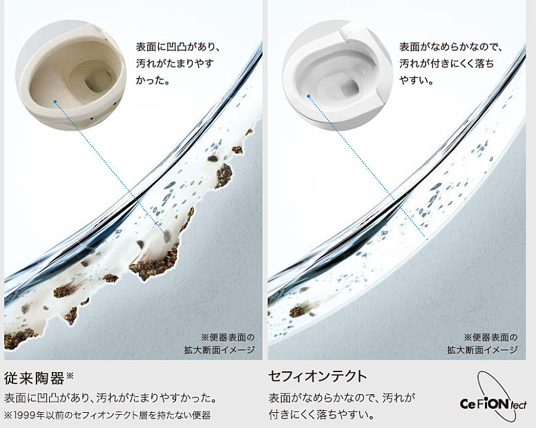 ツルツルな陶器で、汚れが付きにくく清潔が長持ち。陶器表面の凹凸を100万分の1㎜のナノレベルでツルツルに。汚れが付きにくく、落ちやすいTOTO独自の技術です。POINT