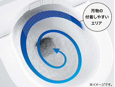 渦を巻くようなトルネード水流が、少ない水を有効に使って、しつこい汚れも効率よく洗浄。便器ボウル面をまんべんなく、しっかりと洗います。POINT