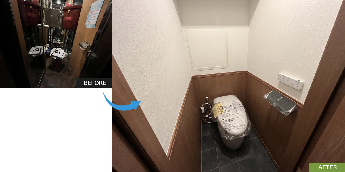 老朽化が進んでいた店舗のトイレと照明器具をリフォーム。暗くどんよりとした印象を与えていた古い照明を、高効率なLED照明へと交換しました。併せて壁紙や床も新調したことで、照明の光が空間全体にムラなく広がるようになり、「以前とは比べものにならないほど明るく、清潔感あふれるお店になった」と大変喜んでいただけました。
